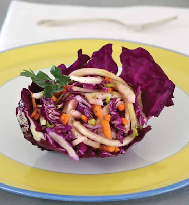 The book includes beautiful photographs along with the recipes, such as this one for Red Cabbage, Fennel, Carrot and Fennel Seed Slaw which has been plated on one of Monet's own dishes, created and designed by him!